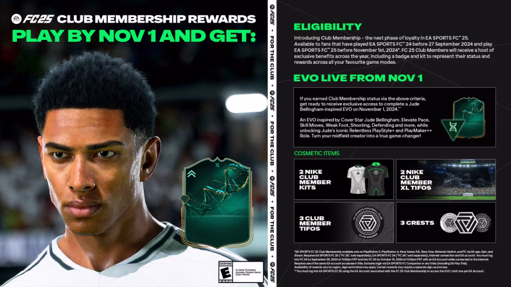 در EA SPORTS FC™ 25، یک ارتقا (EVO) ویژه برای اعضای کلاب که از ستاره کاور بازی، جود بلینگهام الهام گرفته است، معرفی شده است. این ارتقا به بازیکنان اجازه میدهد که ویژگیهای مختلفی از جمله سرعت، حرکات تکنیکی، پای ضعیف، شوتزنی و دفاع را بهبود ببخشند.