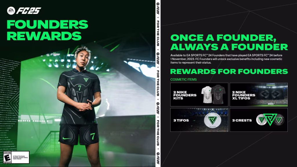 علاوه بر این، بازیکنان با وضعیت بنیانگذار، این شناسه را حفظ کرده و آیتمهای زیباسازی انحصاری در FC 25 دریافت خواهند کرد. همچنین اعضای کلاب از طریق محتوای اختصاصی که در طول سال منتشر میشود، پاداشهای بیشتری دریافت خواهند کرد.