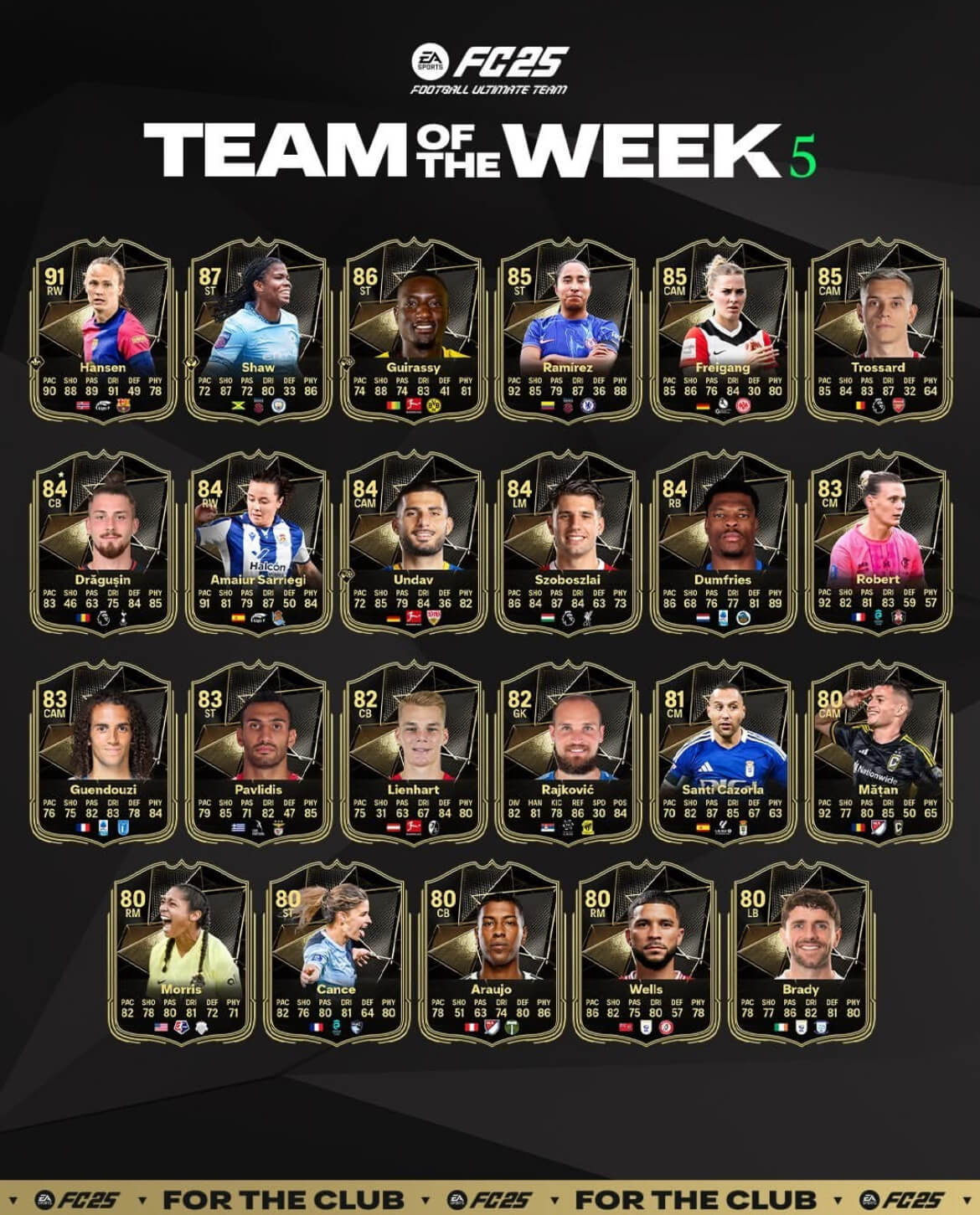 هفته پنجم (TOTW 5) در بازی FC 25 منتشر شد. این در تاریخ 16 اکتبر 2024، تیم منتخب تیم شامل بازیکنان برجسته‌ای است که در مسابقات اخیر عملکرد درخشانی داشته‌اند. TOTW 5 شامل ترکیبی از بازیکنان تهاجمی، مدافعین و دروازه‌بانانی است که هر کدام توانسته‌اند توجه جامعه فوتبالی و گیمرها را به خود جلب کنند. کارت‌های این تیم می‌تواند به بازیکنان حالت Ultimate Team در بازی کمک کند تا تیم‌های خود را تقویت کرده و در رقابت‌ها موفق‌تر باشند. در این متن به بررسی دقیق هر یک از این بازیکنان و ویژگی‌های آنها می‌پردازیم.