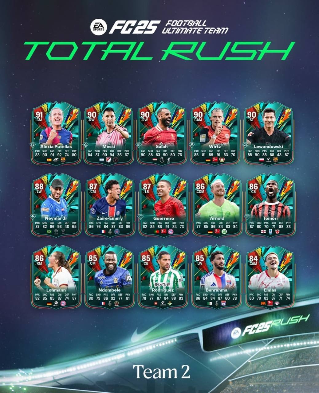 تیم دوم Total Rush در بازی EA Sports FC 25 در ۱۸ اکتبر معرفی شد. این کمپین که بهعنوان جایگزینی برای رویداد Road to the Knockouts (RTTK) ارائه شده است، شامل کارتهای ثابت و بدون قابلیت ارتقاء است. با این حال، این کارتها همچنان میتوانند در حالتهای رقابتی مانند Division Rivals یا FUT Champions بسیار موثر باشند.