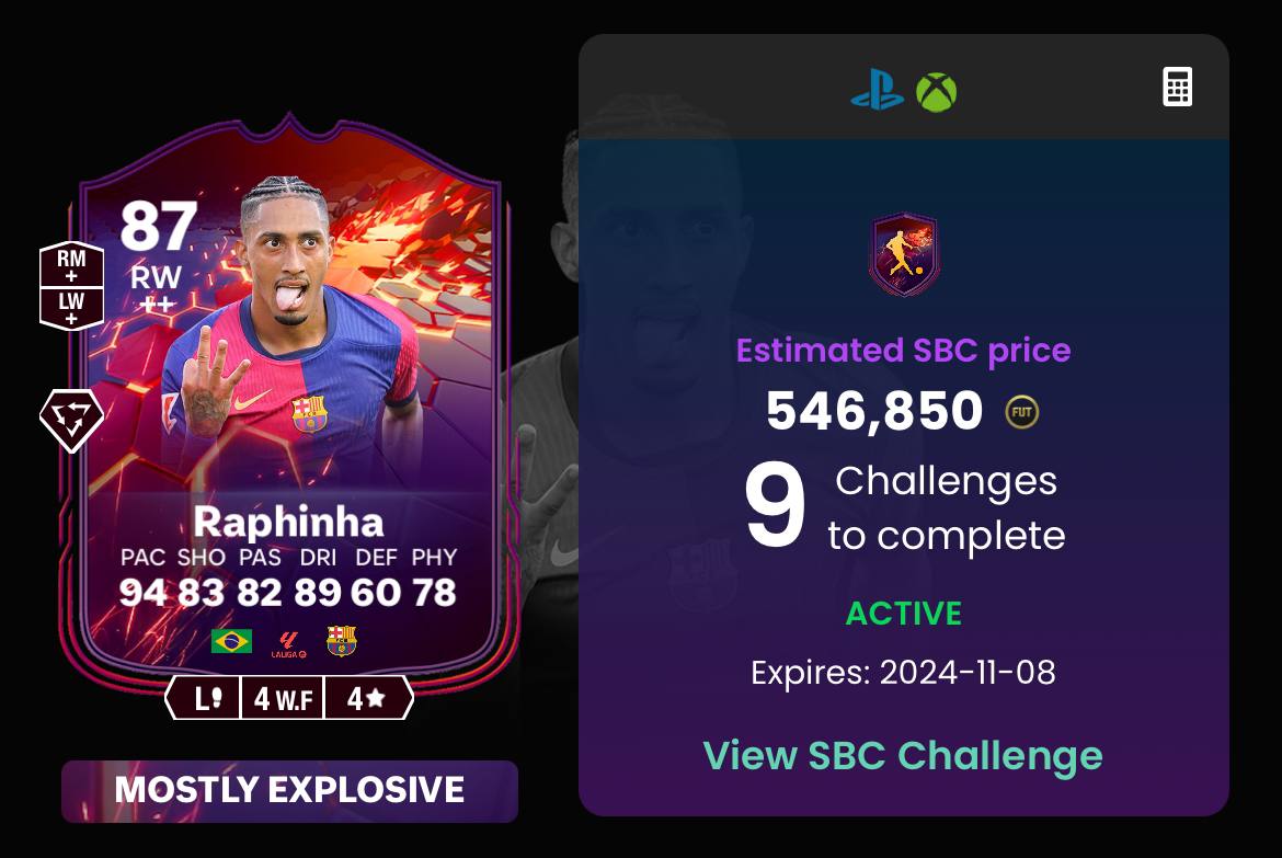 برای دریافت کارت رافینیا، بازیکنان باید SBC مربوطه را تکمیل کنند که شامل چندین اسکواود (ترکیب) است. هر یک از این اسکواودها شرایط خاصی دارد که باید رعایت شود، مانند بازیکنان از یک لیگ خاص یا بازیکنان با امتیاز کلی خاص. تکمیل این چالش‌ها بسته به شرایط ممکن است هزینه قابل توجهی داشته باشد، اما پاداش کارت رافینیا ارزشمند است.