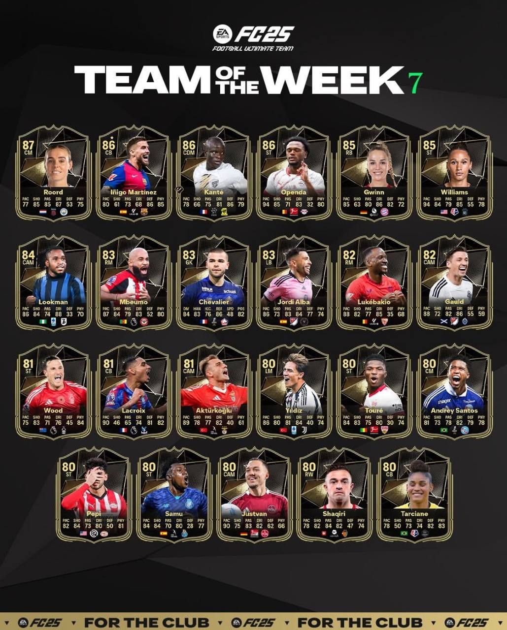 تیم TOTW 7 از بازی FC 25 دارای ترکیبی از بازیکنان با قابلیت‌های مختلف است که می‌تواند در استراتژی‌های هجومی و دفاعی کمک‌کننده باشد. برای تیم‌های هجومی، بازیکنانی چون Openda و Williams توصیه می‌شوند، در حالی که برای تیم‌های دفاعی، بازیکنانی چون Kante و Martinez گزینه‌های خوبی هستند.
