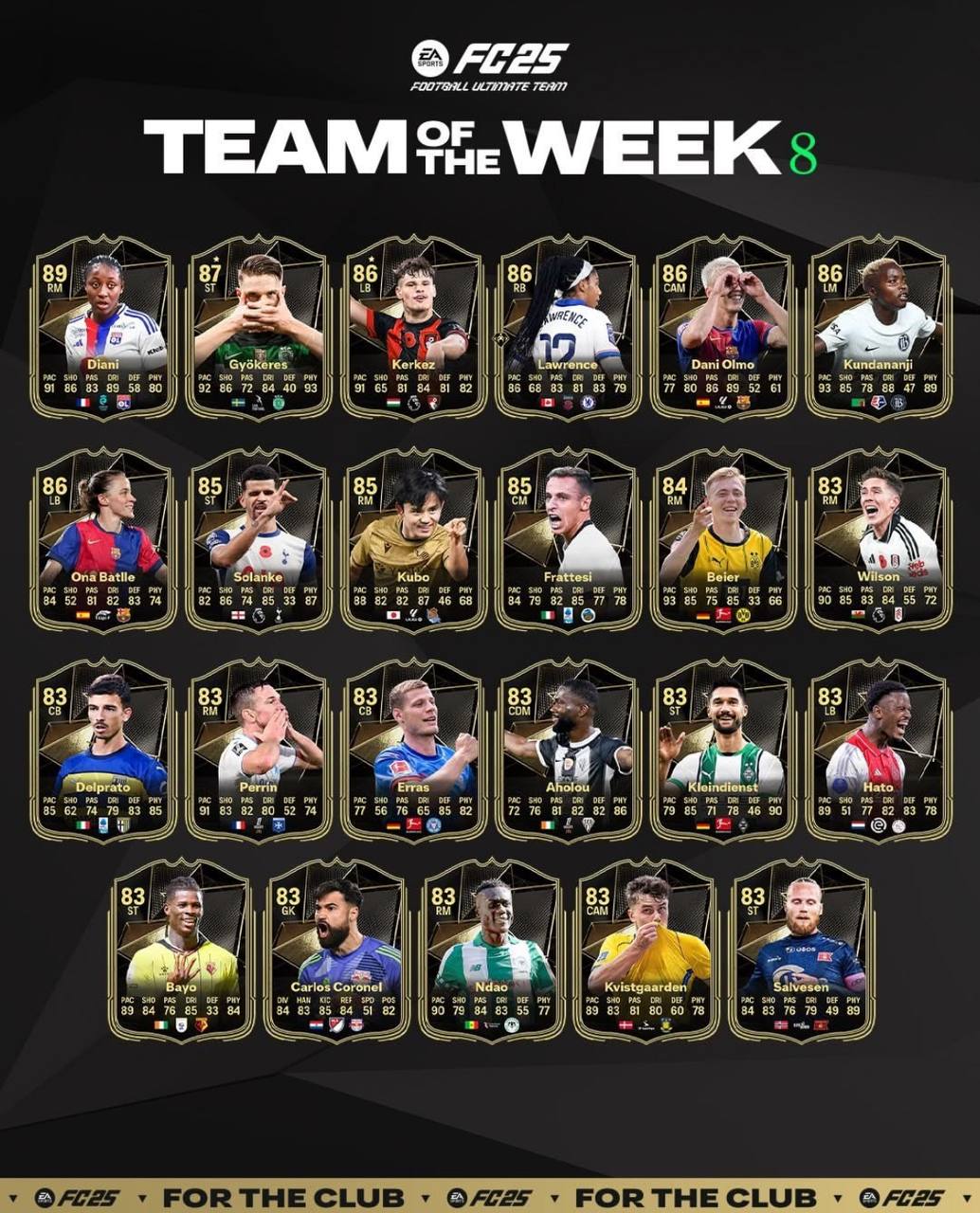 این هفته در بازی FC 25 تیم TOTW (Team of the Week) یا تیم منتخب هفته 8 با بازیکنانی که عملکرد بسیار خوبی در بازی‌های اخیر خود داشته‌اند منتشر شد. هر هفته، این تیم شامل بازیکنان از لیگ‌های مختلف دنیاست که به دلیل عملکرد خیره‌کننده‌شان یک کارت ویژه دریافت می‌کنند. این کارت‌ها در بازی محبوب FIFA Ultimate Team کاربرد زیادی دارند و بازیکنان علاقه‌مند به خرید یا استفاده از این کارت‌ها می‌توانند از بازیکنان جدید بهره‌مند شوند.